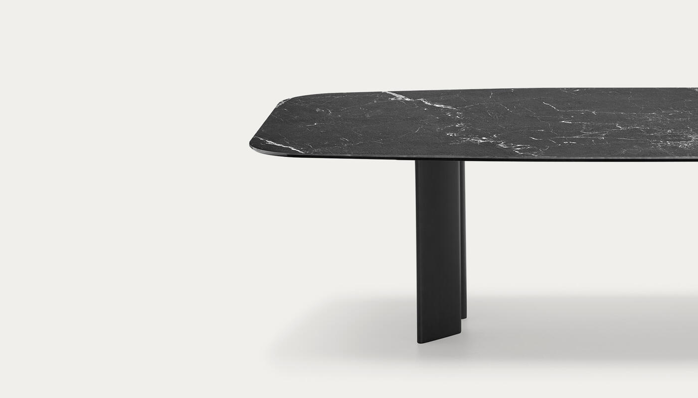 Sandy is a collection of tables that feature a teardrop leg, a cross-section with a sophisticated design that can accommodate different table top geometries – rectangular, round or oval, both fixed and extendable.