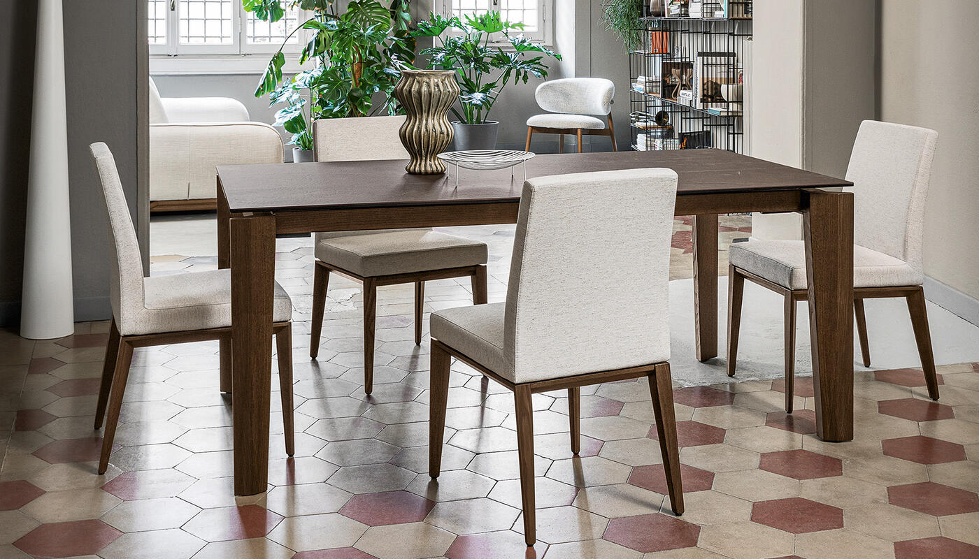 <p>Its design flexibility arises from the combination of wooden legs and a selection of various ceramic tabletop options. Additionally, the subtly tapered and multi-faceted outer legs ensure the highest level of comfort for seated guests, while the extensions are seamlessly integrated into a guided opening frame.</p>