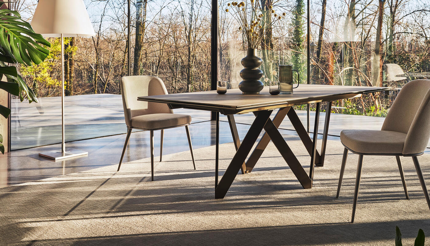 The CARTESIO extendable table is distinguished by its elegant and iconic design, offering a range of ceramic tabletop options supported by an innovative weight-bearing frame in coated metal. The frame is constructed with four independent rectangular "V" elements.