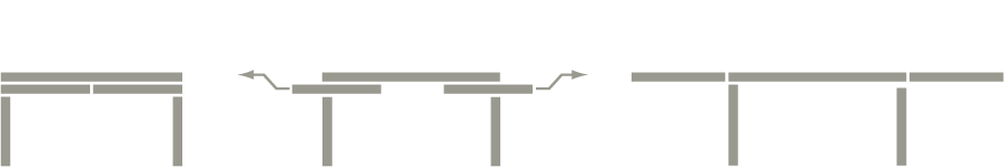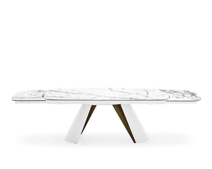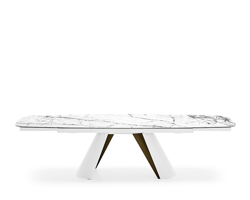 The Apian table is a prime example of a design philosophy that prioritizes architectural elegance and is crafted with great attention to detail, using carefully processed materials. Its design exudes a sense of airiness, drawing inspiration from the sheet metal bent into a semi-cylindrical shape that gently slants upwards, forming a distinct base for the manually-extendable top. Thanks to two side leaves, Apian can be pulled out to reach a total length of 3 meters.