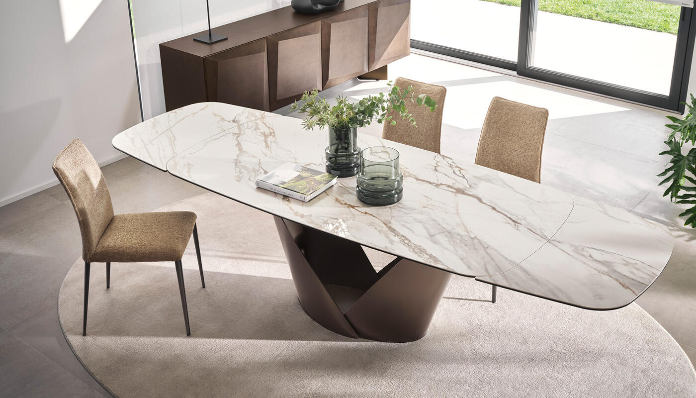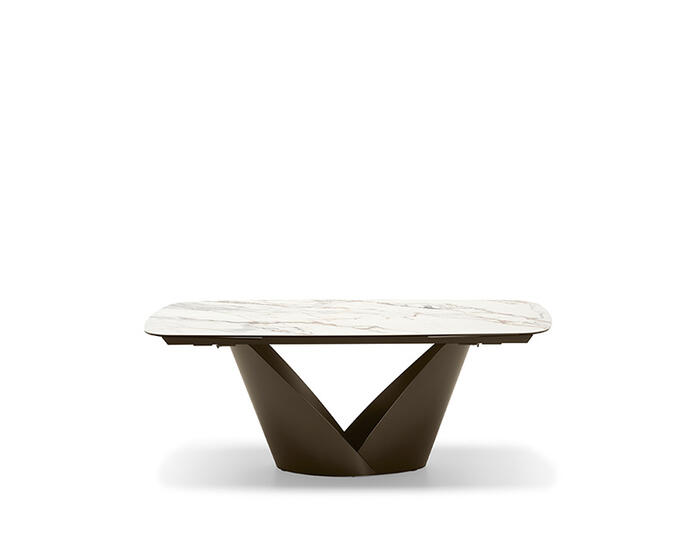 A prominent table, designed to be the centrepiece in the contemporary living space. Calla features a base that resembles a flower – robust yet light, it consists of two metal blades which, as petals do, interlock, creating a chalice shape that opens out upwards, alluding to vitality and rebirth.