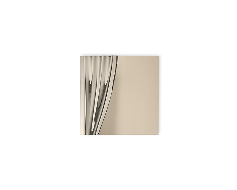 Inspired by the curtain of a theatre, the Sipario square mirror combines curved and flat glass elements in a poetic composition. The surface is divided into two distinct sections: one offering a clear reflection, the other gently distorting the image.