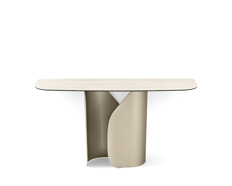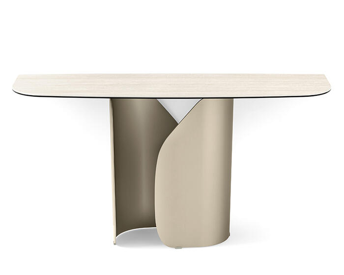 The Twins console, inspired by its namesake table, features gracefully curved metal elements that support a top with rounded corners. Available in a variety of finishes, this console can be customized to suit any style. Its compact dimensions make it an ideal choice for functional and transitional spaces, adding a touch of elegance and practicality.