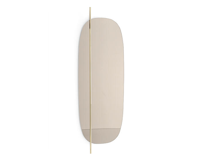Softly rounded glass paired with a slim metal rod defines the Vanity large oblong mirror, offering a contemporary reinterpretation of the traditional wall mirror. The contrast between the gentle curvature of the reflective surface and the precise linear element introduces a confident, graphic character.