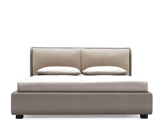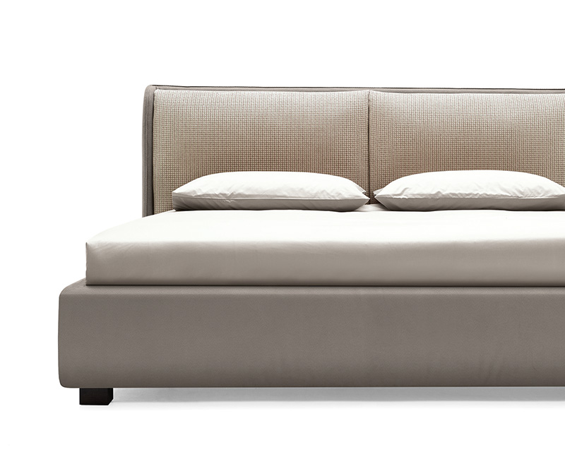 Dolly reinterprets the headboard as an embracing architectural element. Its distinctive shell rises from the base and wraps around two soft cushions, which can be upholstered in matching or contrasting materials to create subtle two-tone or two-material compositions. The result is a bed that feels both protective and expressive, balancing softness with structure.