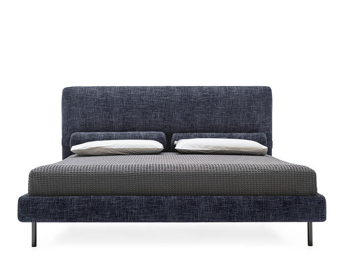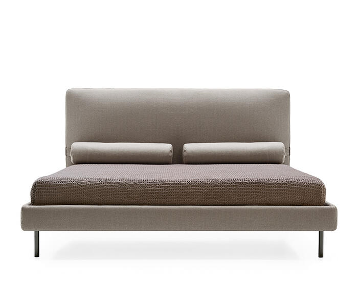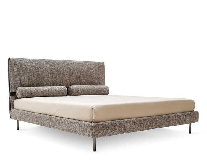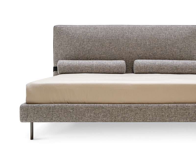 The headboard’s clean, continuous surface reinforces the bed’s linear character, offering generous support for reading or watching television. Optional bolster cushions, discreetly secured with a magnetic fastening, add functional comfort while maintaining an orderly, refined appearance. Available upholstered in fabric or leather, Mies combines clarity of form with a considered approach to everyday comfort.