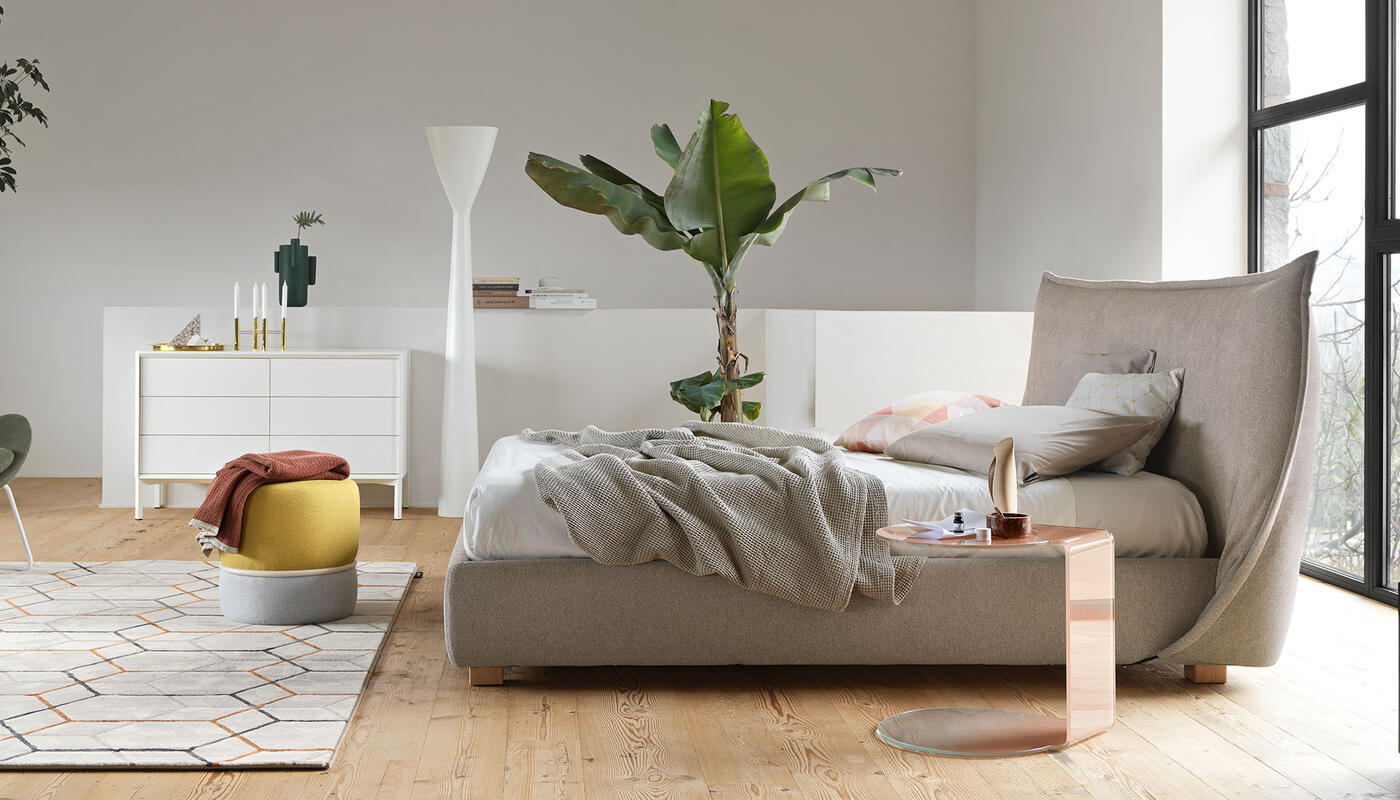 The effect recalls an oversized cushion, reinforced by the fully padded bed frame, resulting in a visually soft and welcoming composition. Available with a fixed base or with an integrated storage compartment, Softly balances tactile comfort with everyday practicality, while maintaining a relaxed, informal presence in the bedroom.