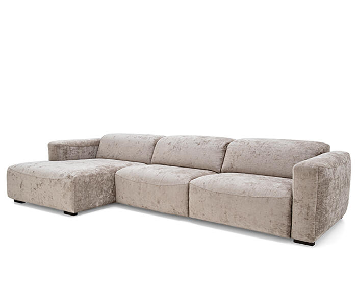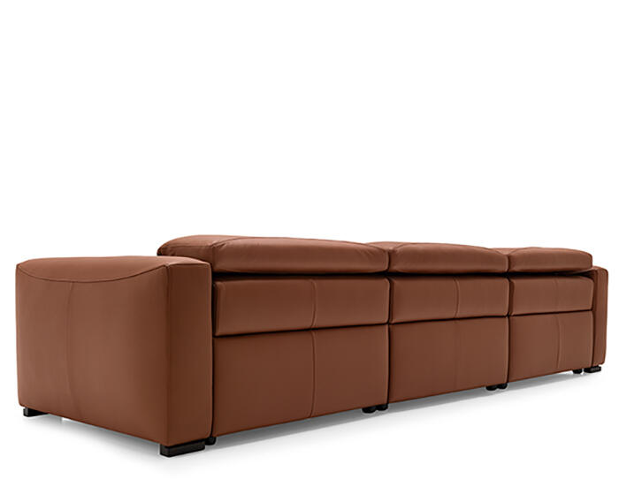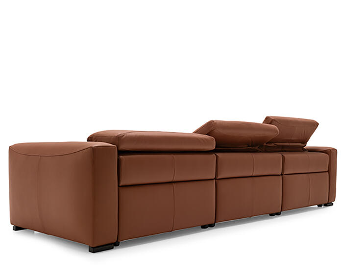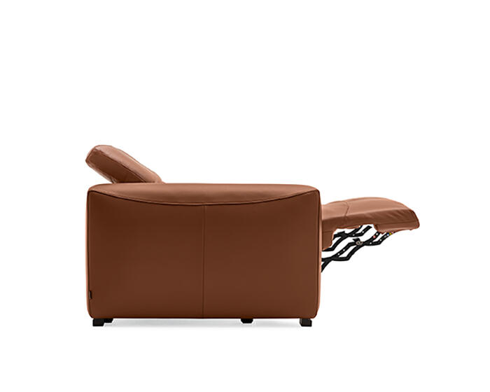 An integrated electric mechanism allows the backrest to recline and the footrest to rise smoothly, adapting the sofa to moments of rest and relaxation. A manually adjustable headrest completes the experience, offering additional support and allowing the posture to shift from upright to fully relaxed with ease.